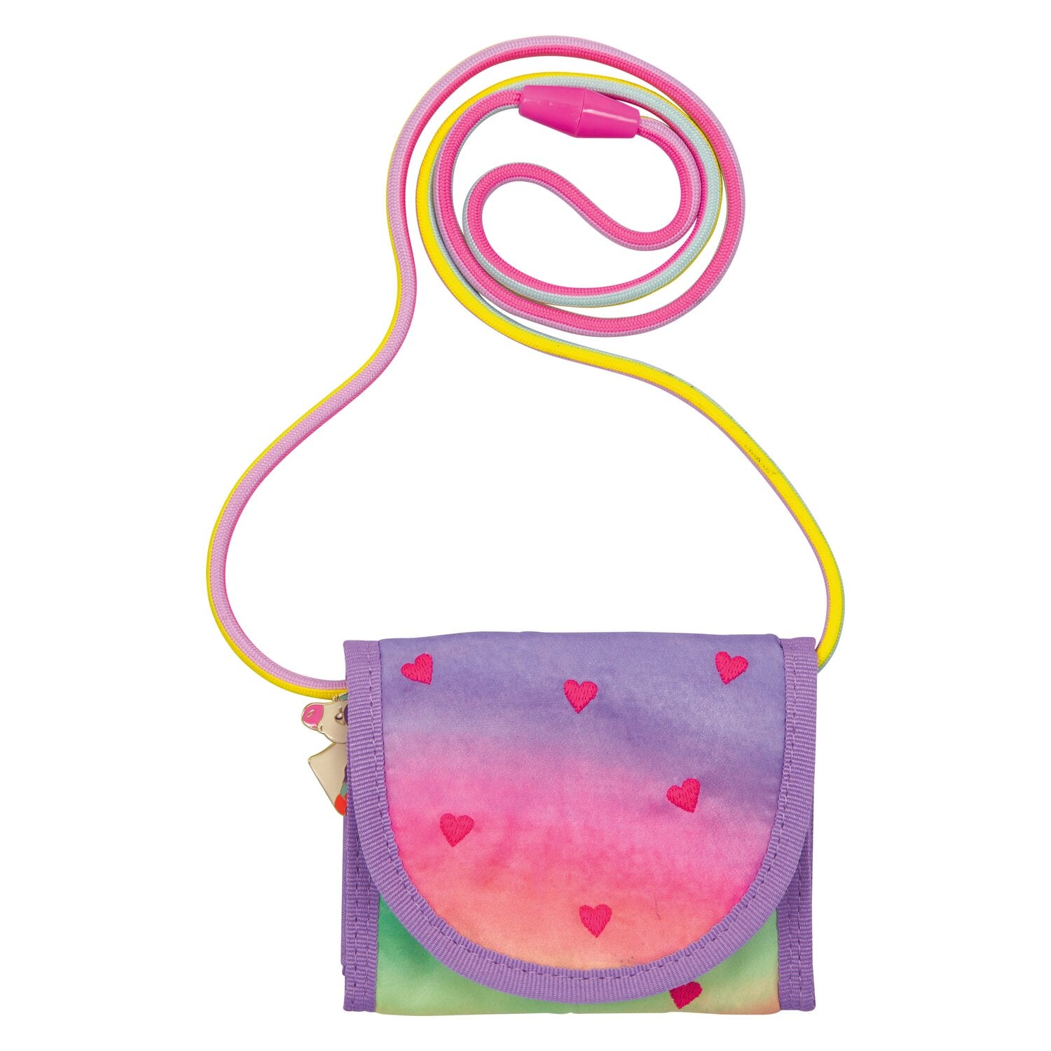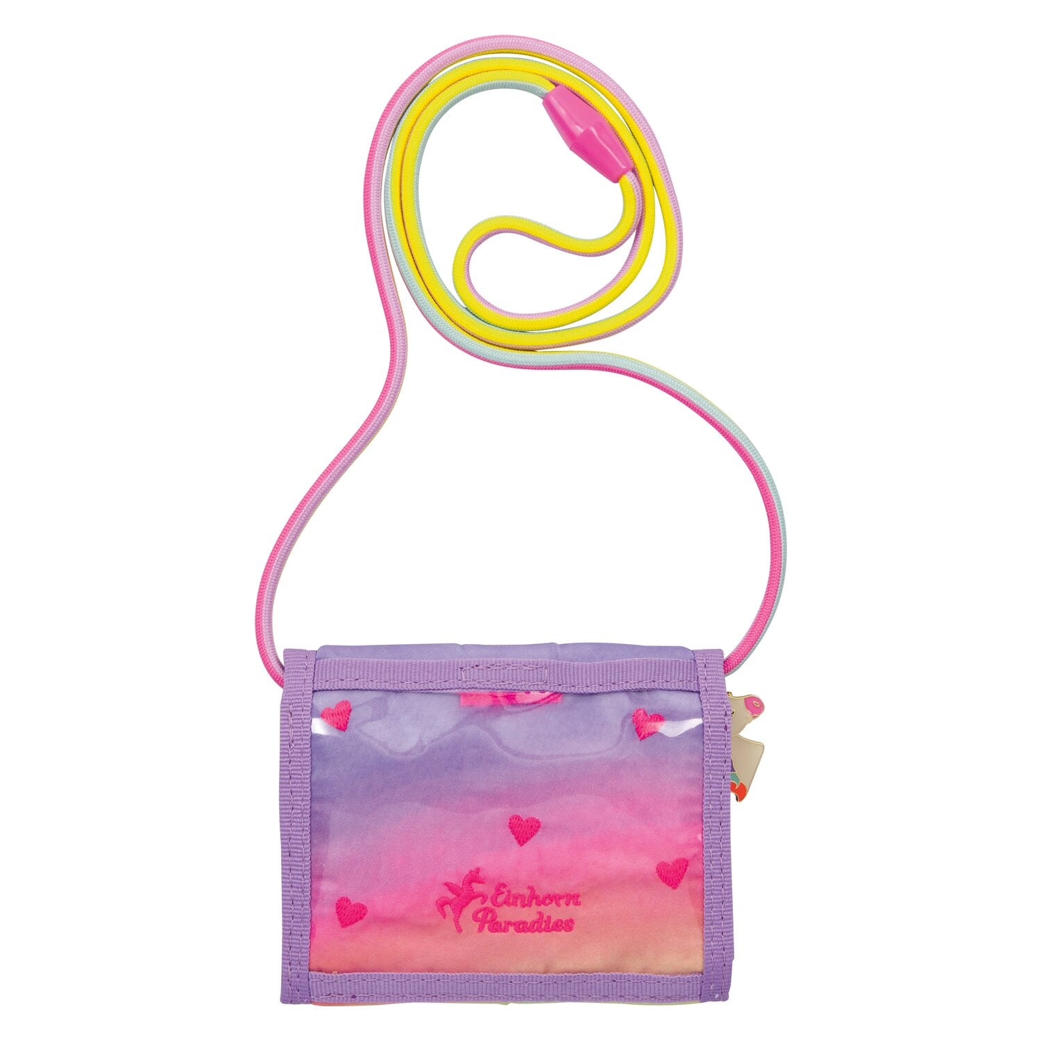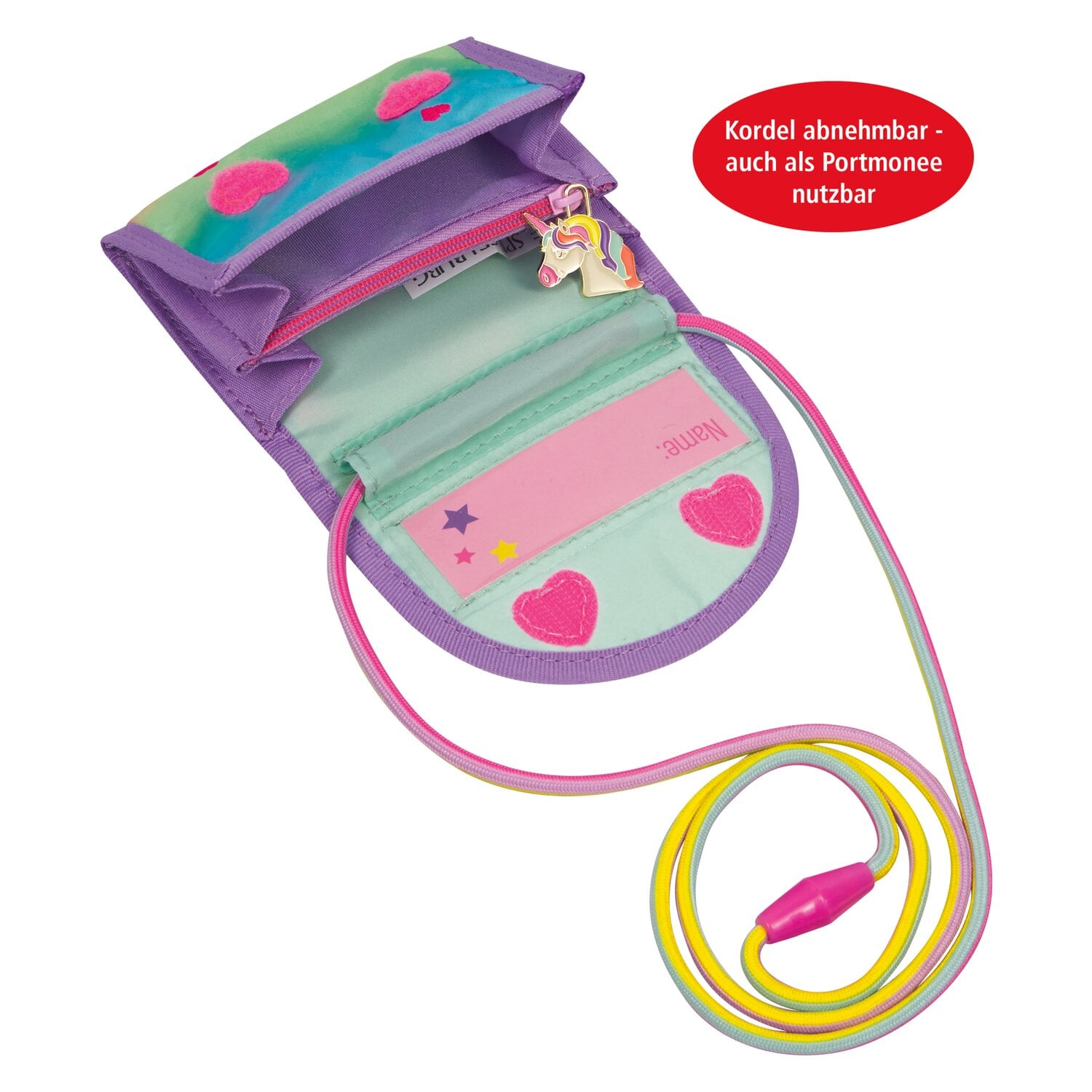 Der Brustbeutel Regenbogen „Einhorn-Paradies“ von DIE SPIEGELBURG bringt einen zauberhaften Farbverlauf in kräftigen Pastelltönen mit, der wie ein kleiner