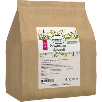 Einzelfuttermittel für Pferde. Die Bergwiesen-Leckerli frei von Getreide und Melasse sind die perfekte Belohnung für Pferde, die an Getreideunverträglichkeiten leiden. Die schmackhaften Leckerbissen passen in jede Tasche und eignen sich ideal für unterwegs oder zur Fütterung auf der Weide. Umweltfreundlich in praktischer Tüte aus Kraftpapier verpackt.