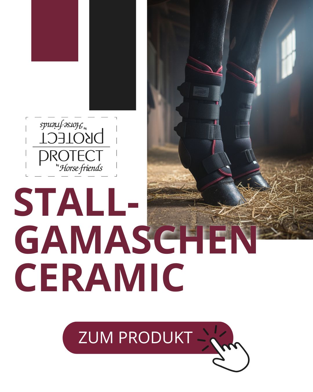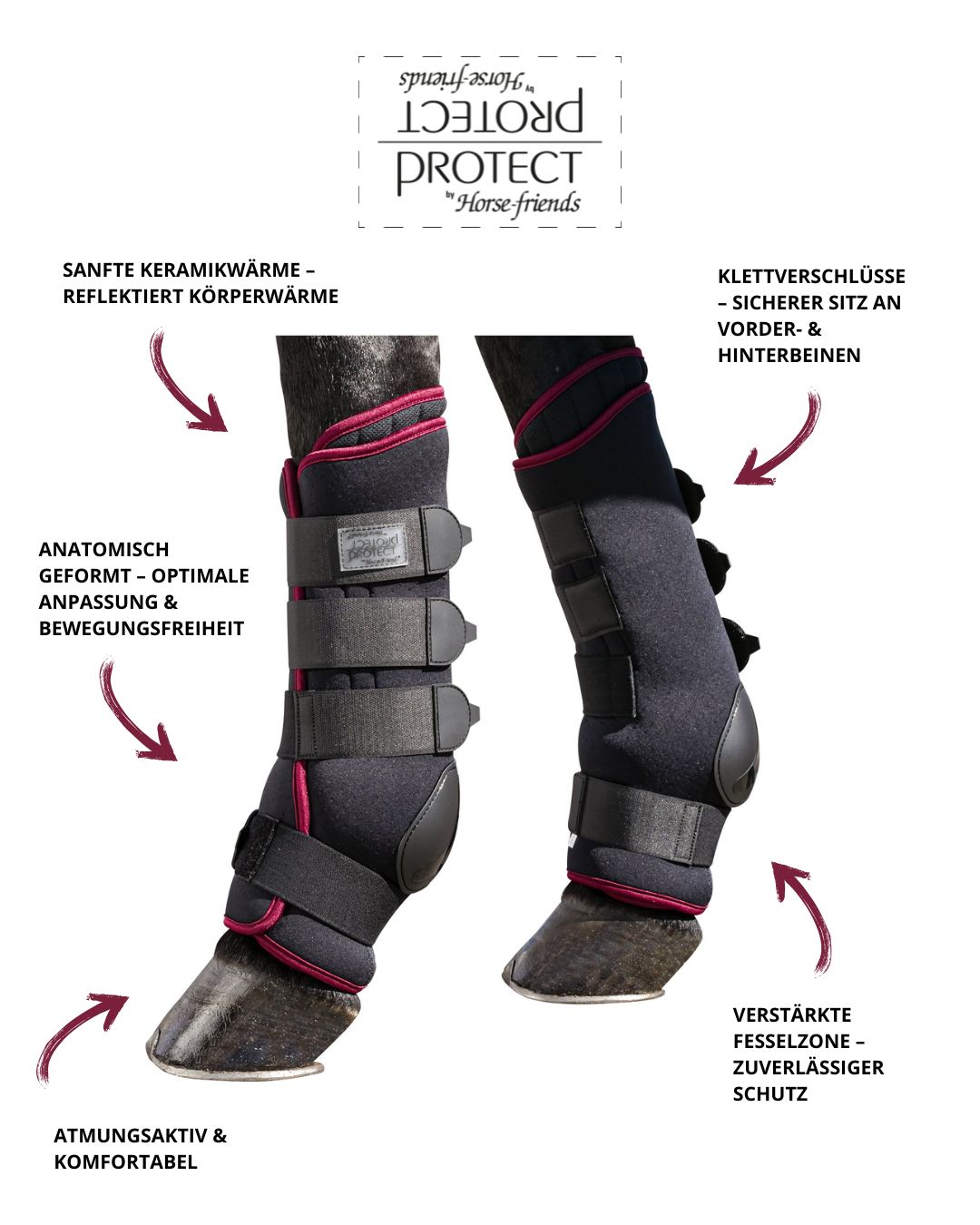 Die PROTECT by Horse-friends Stallgamaschen Ceramic bieten sanfte Wärme, Schutz und optimalen Komfort für die Stallruhe. Die herausnehmbaren Keramikkissen reflektieren die natürliche Körperwärme und können so die Durchblutung fördern und verspannte Sehnen- und Gelenkbereiche angenehm warmhalten. Dank anatomischer Form, atmungsaktivem Material und verstärkter Fesselzone sitzen die Gamaschen sicher, ohne die Beweglichkeit einzuschränken. Ideal für ältere Pferde, zur Regeneration nach Belastung oder für kühle Nächte im Stall.